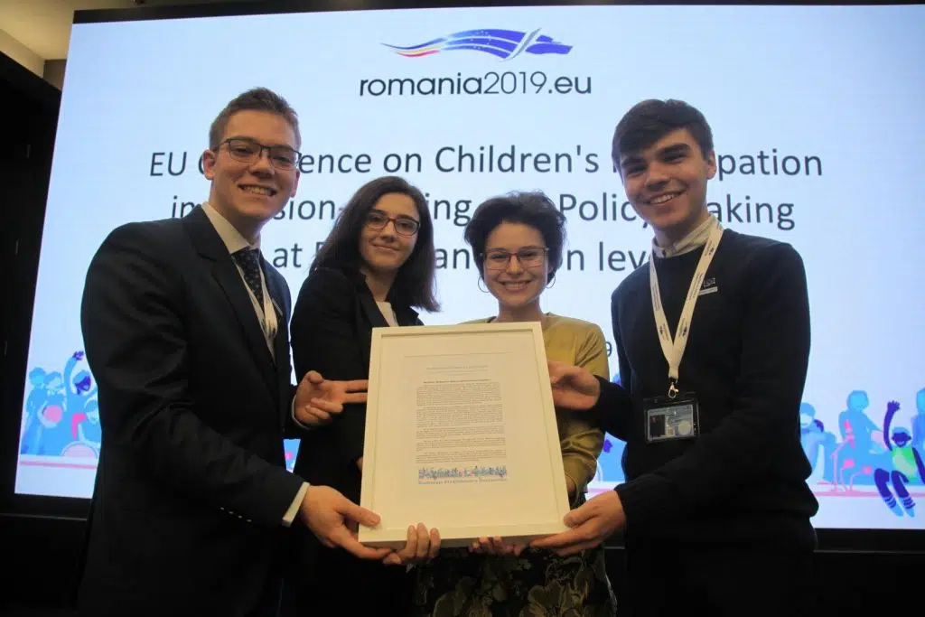 En mai 2019, 60 enfants âgés de 10 à 19 ans et issus de 16 pays différents se sont réunis à Bucarest pour finaliser la Déclaration de Bucarest et échanger avec des décideurs politiques, avant l’adoption de la Déclaration par les Etats membres de l’UE !