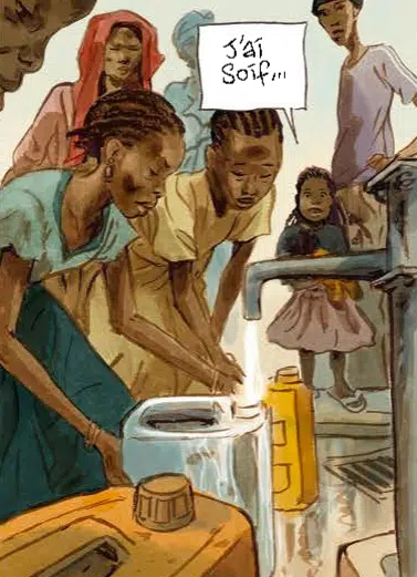 - Nialony demande à son frère si le camp est comme une « prison en plein air », et Georges lui répond qu’ils y sont protégés des dangers extérieurs. Dans le contexte du Soudan du Sud, de quels dangers parlent-ils ? (Réponse : les personnes vivants dans le camp sont protégées des conflits violents qui ont lieu dans le pays. On voit des militaires qui gardent le lieu en page 21, et Georges évoque les femmes, car elles ont plus de risques à l’extérieur de subir des violences, notamment sexuelles. Pour les enfants, la protection contre les violences est définie par les articles 19 et 34 de la CIDE.)