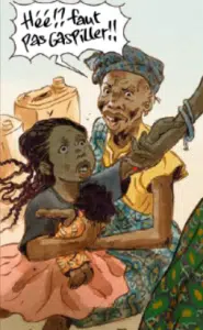 - Comment expliquez-vous la réaction de la femme dans la case ci-dessous, quand Nialony essaie de faire boire sa poupée ? (Réponse libre)