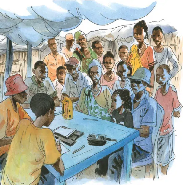 - D’après ce qui est décrit à la page 20, y a-t-il des abris solides pour toutes les personnes vivants dans le camp ? En quoi sont construites les maisons du camp ? Qu’est-ce qui est fait pour les protéger des écoulements liés à la pluie ? (Réponse : beaucoup de personnes n’ont pas d’abri solide dans le camp. Les maisons sont construites en bois, roseaux et boue. Des tranchées permettent de les protéger des écoulements.)