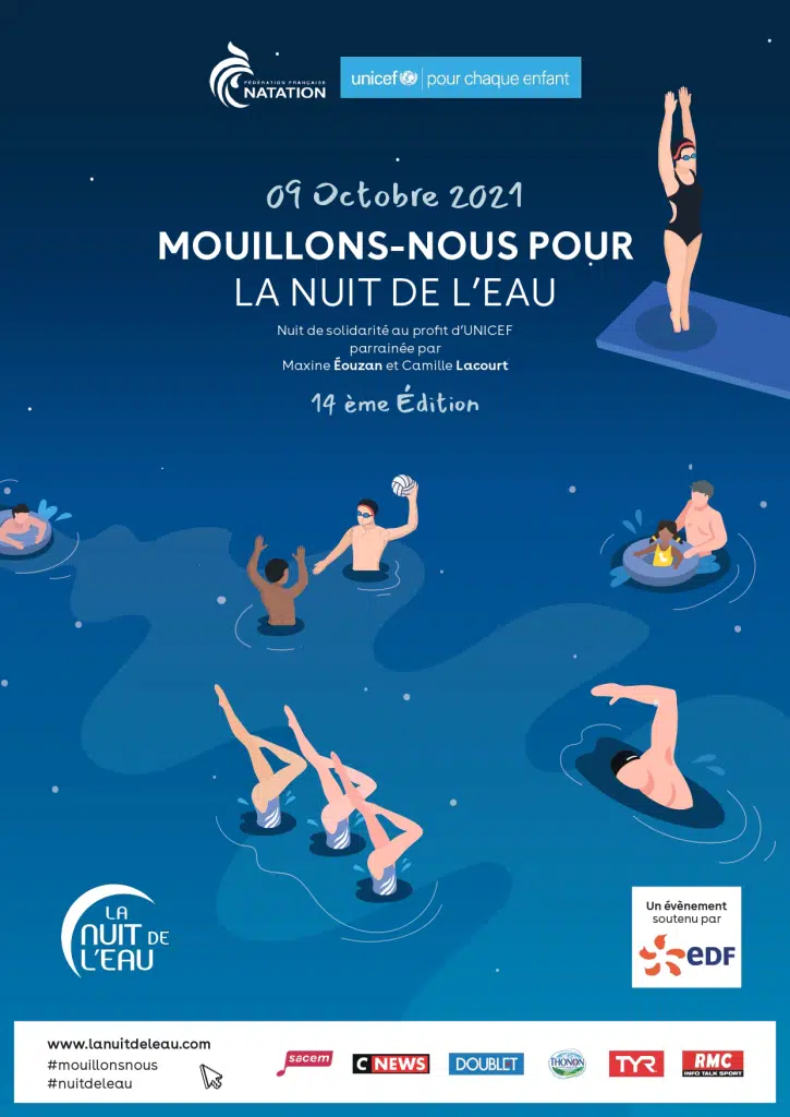 Du 18 septembre au 16 octobre 2021, les enfants et les jeunes participent à un grand défi digital entre le parrain emblématique de l’événement Camille Lacourt, quintuple champion du Monde de Natation et la nouvelle marraine de la Nuit de l’Eau Maxine Eouzan, ancienne plongeuse de haut niveau, journaliste et gagnante de Koh Lanta 2021. Le défi collectif digital viendra en complément de l’édition physique qui aura lieu le samedi 9 octobre 2021 dans les piscines, partout en France pour célébrer la 14ème édition de la Nuit de l’Eau !
