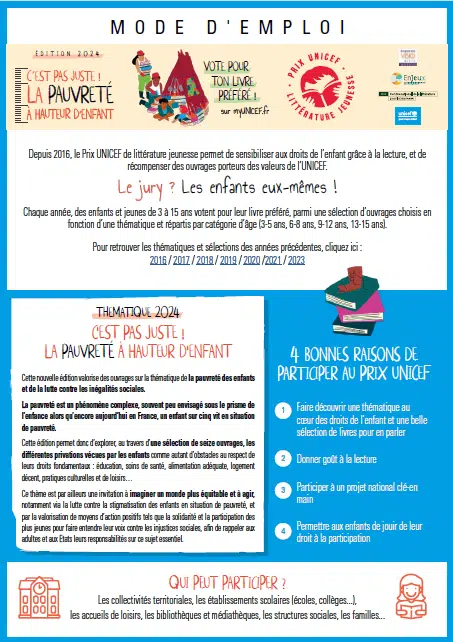 Comme chaque année, l’UNICEF France propose, en partenariat avec EnJeu[x] – Pôle universitaire ligérien d’études sur l’enfance-jeunesse, des ressources pédagogiques adaptées aux différentes catégories d’âge pour accompagner la lecture des ouvrages et sensibiliser les enfants à la thématique de la pauvreté et des inégalités sociales. Téléchargez-les ci-dessous !