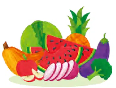 2° Dessine ou imprime en deux fois des motifs d’aliments (fruits, légumes etc.). Au final tu dois te retrouver avec 5 motifs X 2.