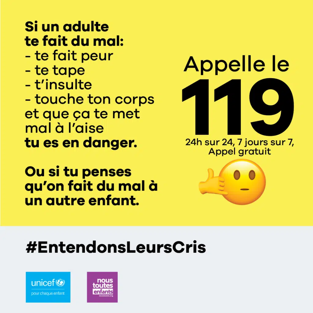 Si c’est ton cas ou celui d’un enfant que tu connais, sache que ce n’est pas de ta faute, que ces violences sont interdites et que l’on a pas le droit de te faire du mal. Des adultes sont là pour t’aider, tu peux appeler le numéro 119 depuis un portable ou un téléphone fixe, tous les jours, 24h/24. C’est gratuit, on ne saura pas que tu as appelé, et on pourra t’aider et t’accompagner pour trouver des solutions. Peut-être que tu ne sais pas si c’est grave ou pas : appelle quand même, les adultes pourront te dire si c’est grave ou pas.